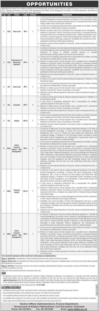 Qualified individuals are encouraged to apply for the following roles under a one-year contract within the Corporate Governance Unit (CGU) and the Internal Support Unit (ISU). Apart from this, there are opportunities in the Debt Management Unit (DMU) and Risk Management Unit (RMU) of the Ministry of Finance, all of which are under the Khyber Pakhtunkhwa government.