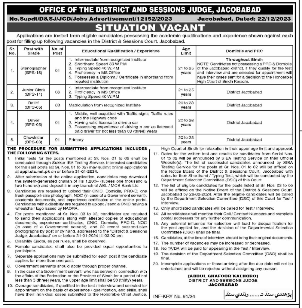 Job opportunities in Jacobabad district and Congress courts were announced through a recent notice in January 2024. Applications Applications are invited from suitably qualified candidates who meet the educational qualification and experience requirements defined for each post.