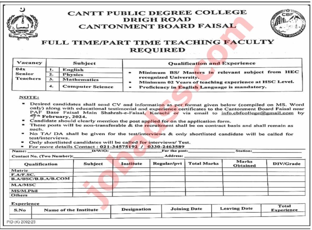 Karachi’s prestigious institution actively recruits talented and dynamic male and female faculty members who teach on various subjects. They are especially looking for senior teachers with experience in English, physics, mathematics and computer science. This opportunity is ideal for individuals who are passionate about teaching and specialize in these specific subjects. If you have the required skills and passion for education, consider applying to be part of the faculty of this prestigious institution, which is contributing to the academic growth and development of students in Karachi.Applicants applying for Faisal Board (CBF) Cantonment Board (CBF) jobs should have a BS/Master’s degree with a formally recognized First Division from the Pakistan Higher Education Commission. In addition, at least two years of teaching experience is required for the exam. This educational and experiential requirement ensures that candidates bring a solid educational background and relevant teaching experience to play an effective role in the educational goals of Cantonment Board Faisal. If you meet these criteria, consider applying for the opportunity to add your expertise and experience to CBF’s educational efforts.
